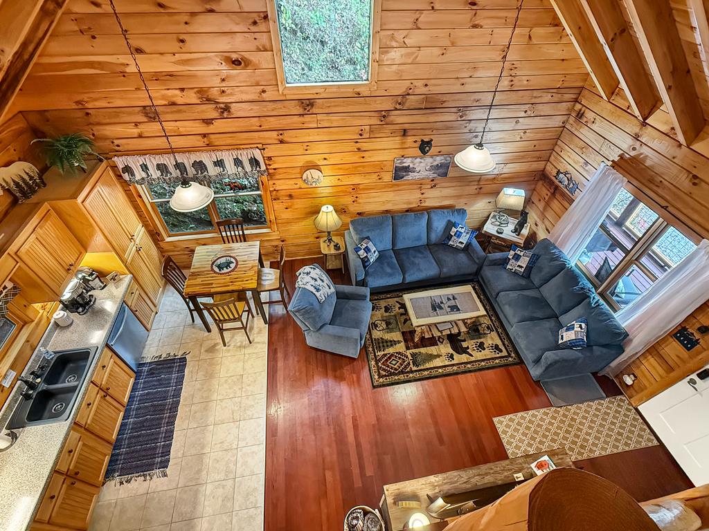 Step inside to discover a warm, open-concept living space featuring vaulted ceilings, natural wood interiors, and large windows framing the mountain scenery. The comfortable living room invites you to unwind on the plush sectional sofa while streaming your favorite shows on one of the 2 flat-screen Smart TVs or enjoying a friendly game of pool in the evening.