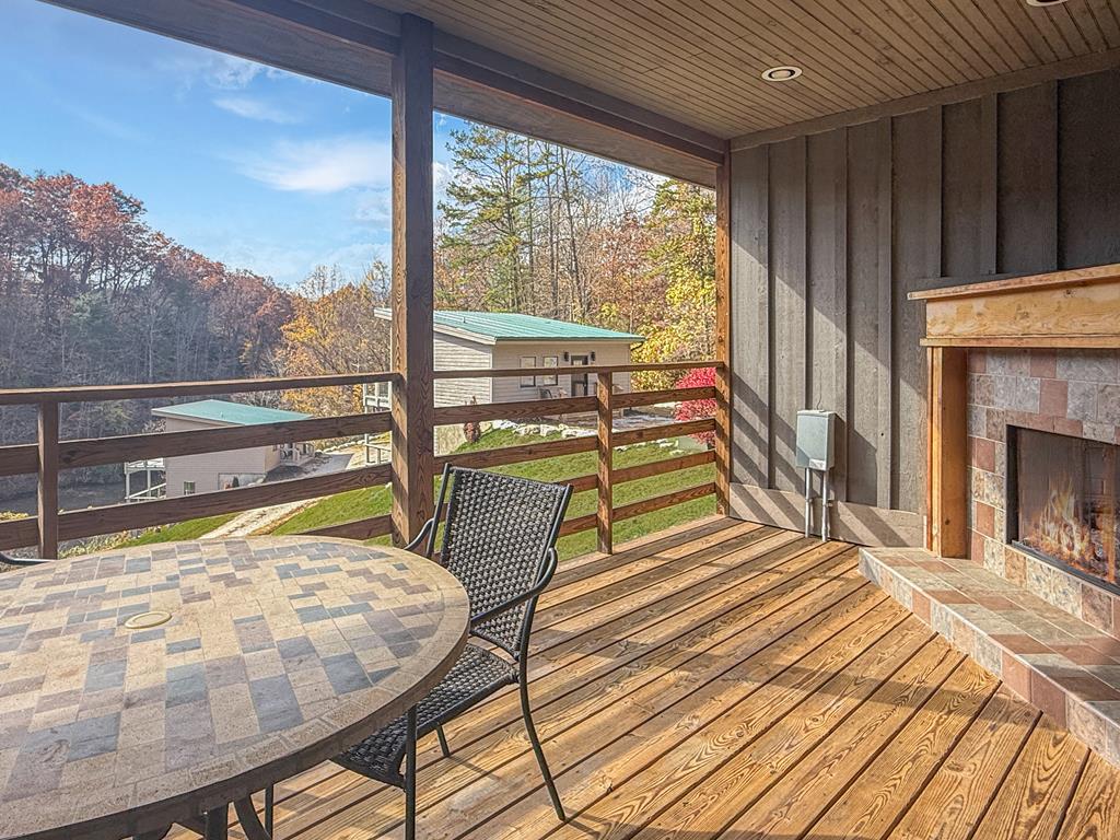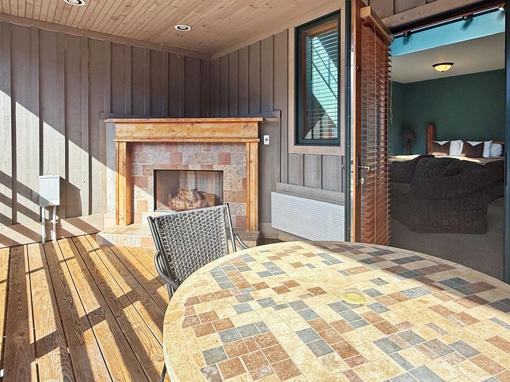 Step through the glass doors onto your covered deck, where a second gas fireplace and outdoor table create the perfect space for morning coffee, quiet evenings, or simply taking in the fresh mountain air. Surrounded by trees and gentle scenic views, it’s a peaceful outdoor extension of the suite.
