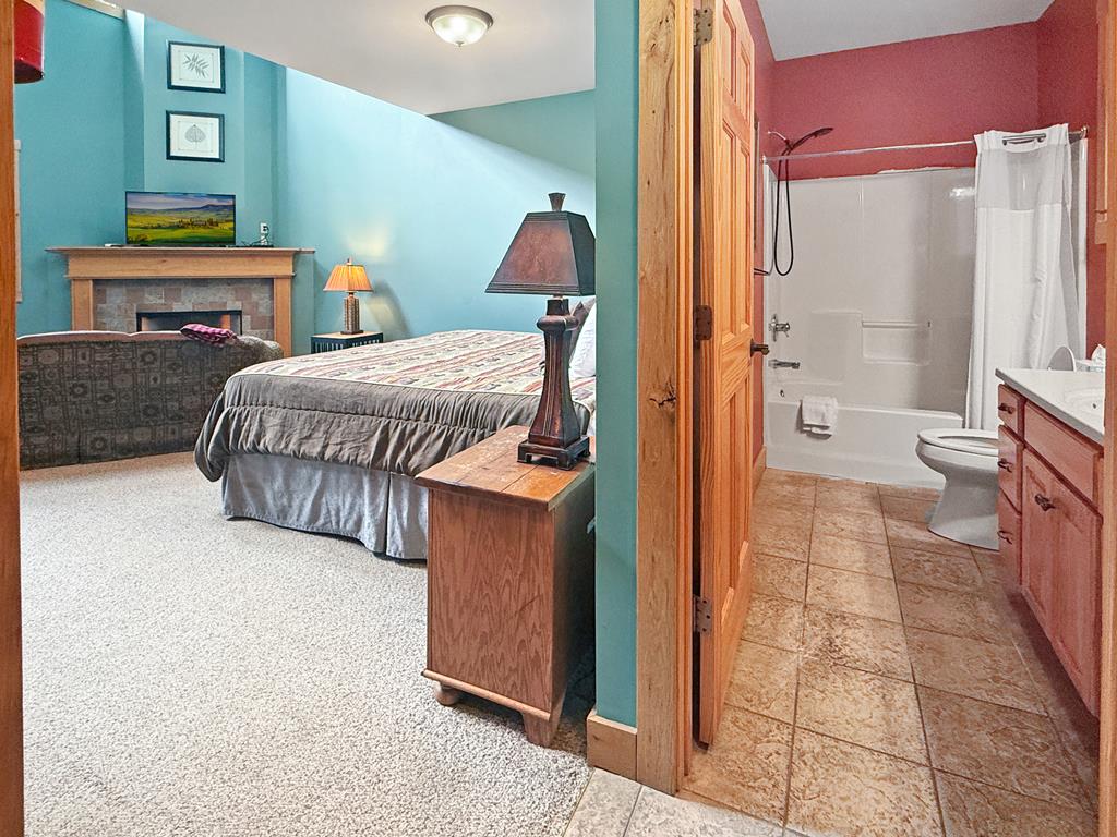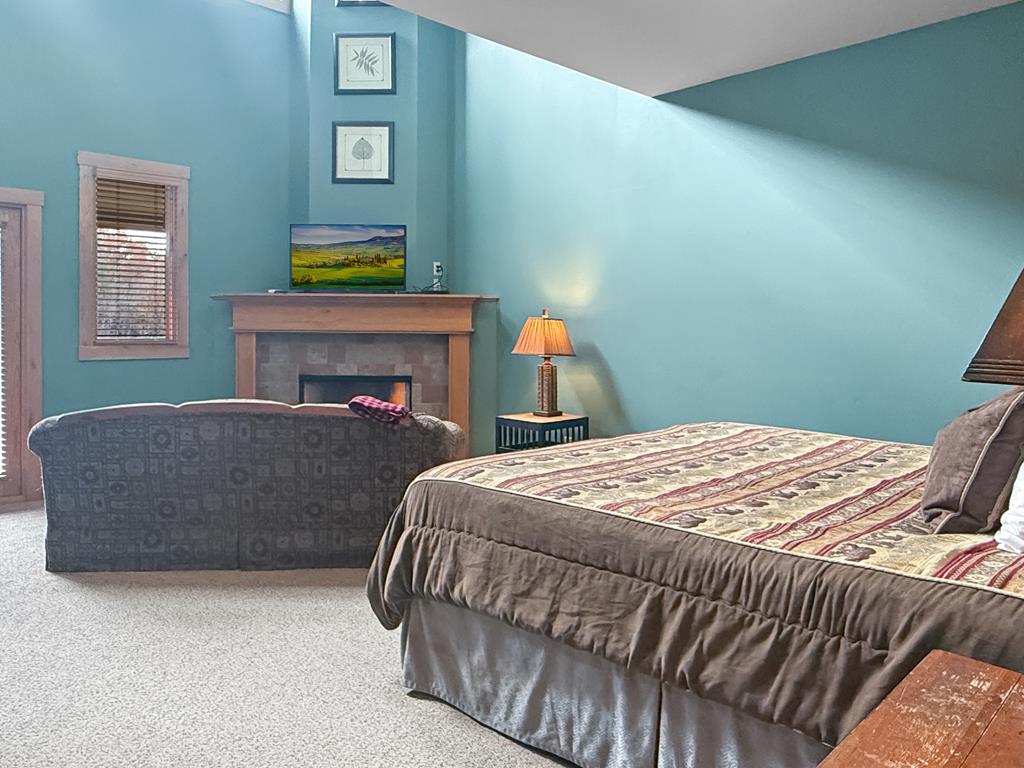 The main level features a king-sized bed, comfortable seating area, and a gas fireplace that adds warmth and ambiance. A 42" Smart TV offers streaming capabilities (bring your own passwords), perfect for unwinding in the evening.