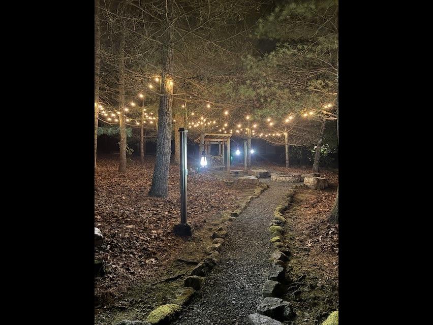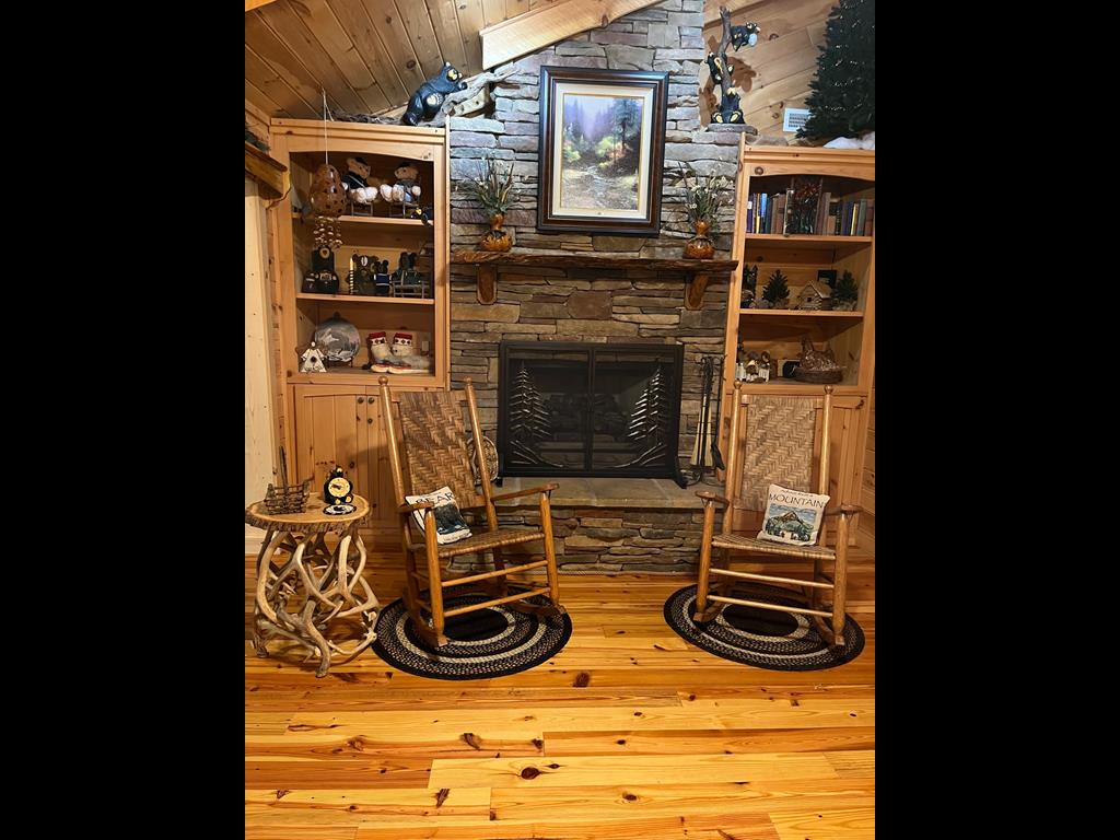Entertainment elements include Big Screen TV, DVD, satellite system with movie channels, and stereo systems.The large four season back porch which overlooks the creek has now been integrated in to the living area to create an expansive space filled with handcrafted log furniture including an Amish swing and many folksy antiquities. But the magic of Creeksong lies outside, along the creek. Picnic in the gazebo. Swing in the hammock. Sit around the fire pit on the rock benches. Try out the loungers on the flagstone patio on the creek bank. Grill out on the covered rock and tile patio. Relax in the hot tub overlooking the creek. At night, you can flip a switch and light up the whole creek! The sight of cascading waters and moss covered boulders underneath a canopy of mountain laurel & rhododendron awaits you at Creeksong.