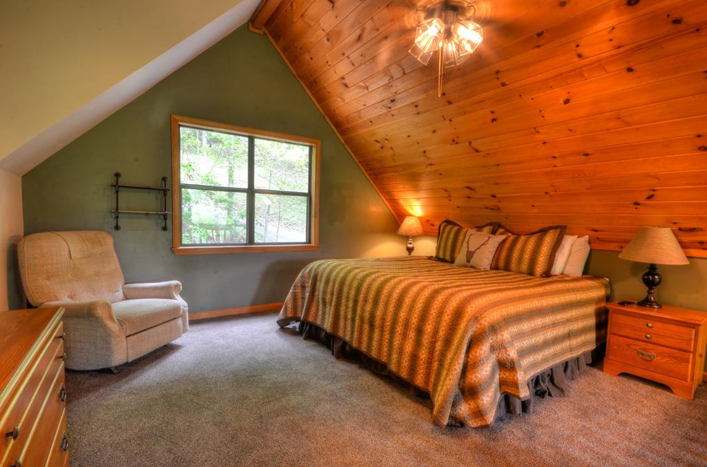 The main floor features a cozy king bedroom with a TV and Roku device for your entertainment. A full bathroom is conveniently located just outside the bedroom. On the second floor, a spacious loft offers an additional king-sized bed, a second full bathroom, and another TV and Blu-ray player, allowing you to enjoy all the same streaming options available downstairs.
