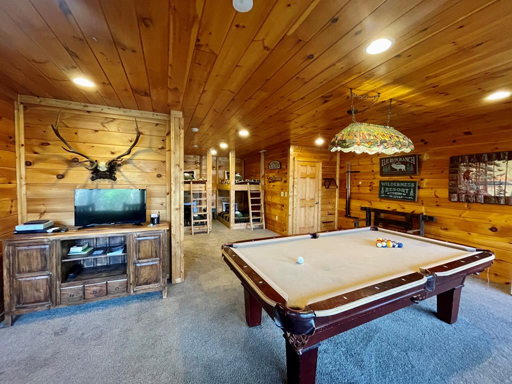 The great room features large living and dining area with table suitable for seating 8. The modern-rustic decor features leather sofa/loveseat, hardwood floors, stone fireplace and log-wall interiors. There is satellite dish and stereo system complete with Bose speakers and CD/DVD player (bring your own music or listen to one of the dozens of digital music channels provided by digital satellite). There is additional common space in the lower level where a queen futon functions as a sofa to watch tv or play pool.